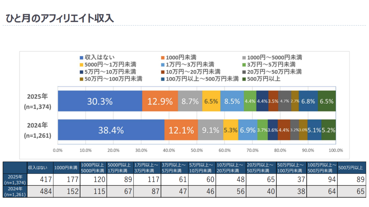 NPO法人アフィリエイトマーケティング協会が2025年に行った調査では、アフィリエイト収入がまったくない人が30.3%、月収1万円未満の人が28.1%という結果でした。